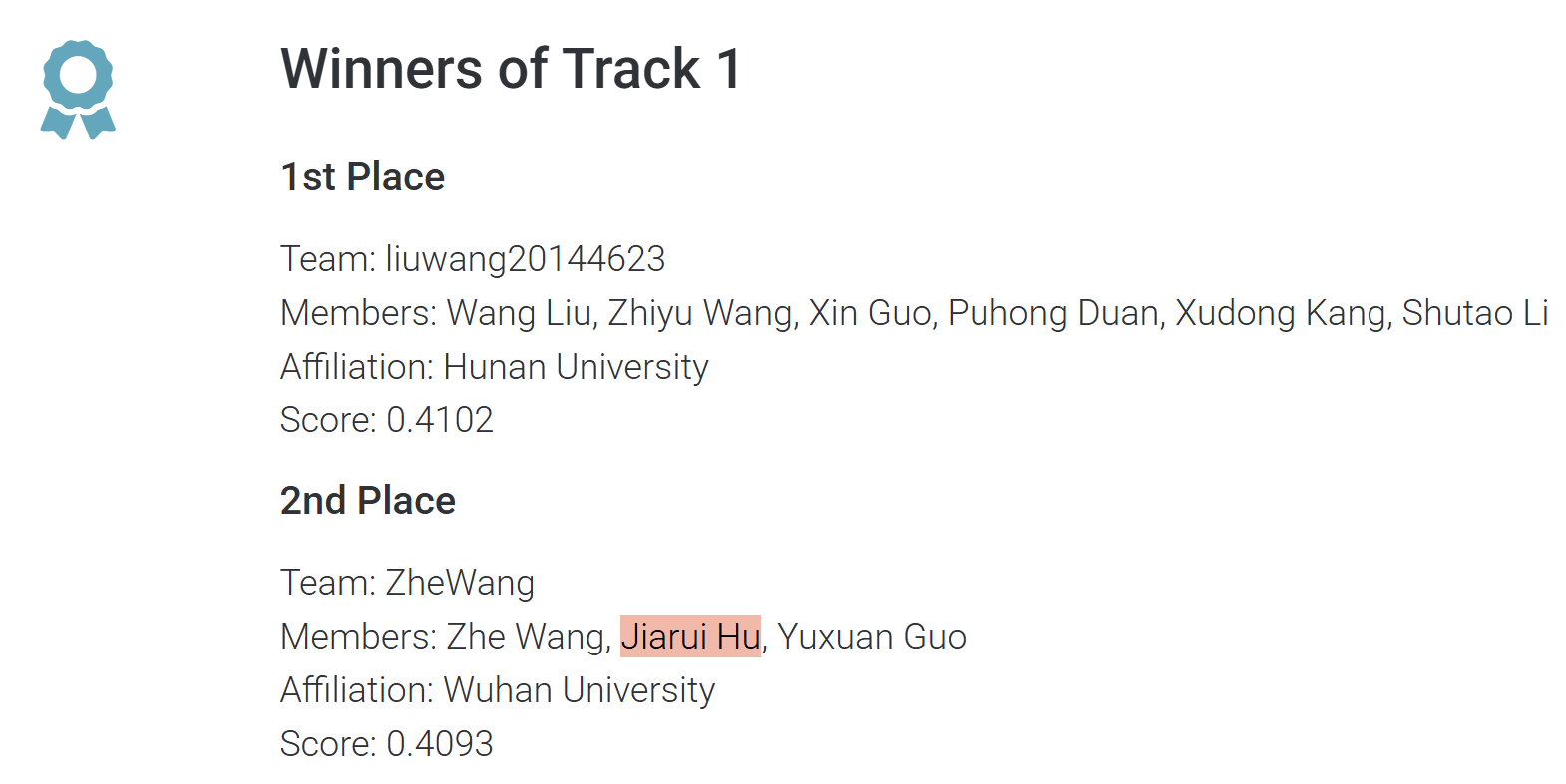 小组成员胡佳睿在赛道一中获得第二名的好成绩。